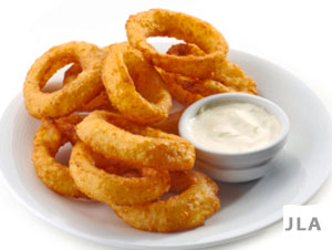 Populares, deliciosos y crujientes aros de cebolla enharinados, listos para freir y servir.