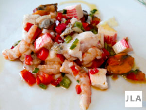 pulpo,langotino,cebolla,pimiento.Cangrejo y mejillon