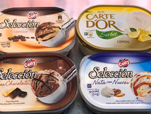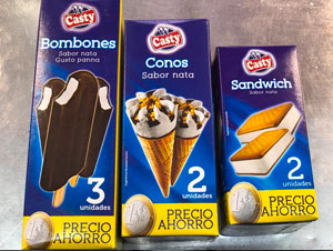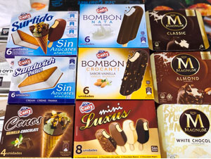 Conos vainilla, chocolate, nata, fresa. Bombón almendrado, Bombón nata chocolate, Surtido mini luscus, Sin azúcar varios sabores, Magnum, Almendrado, Chocolate blanco, Chocolate negro.